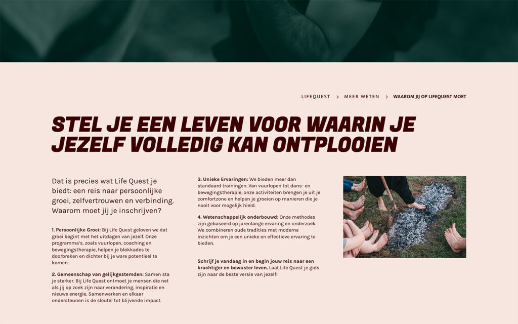 Het resultaat is een logo en branding die het pad van innerlijke én uiterlijke reis symboliseren, en een website die bezoekers meteen meeneemt in die beleving: helder, avontuurlijk en activerend.